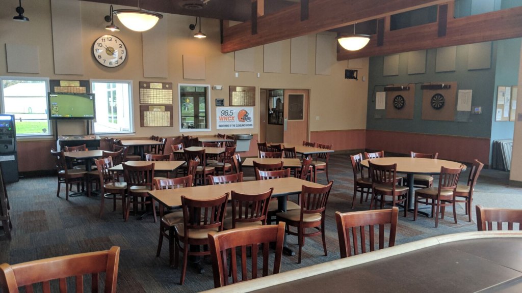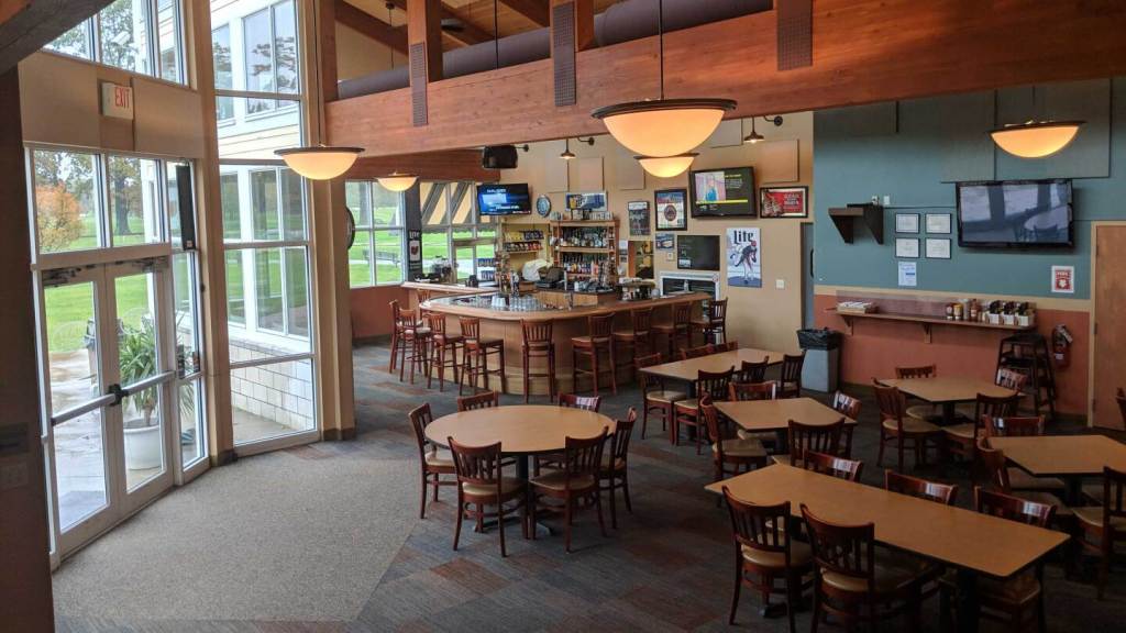 Two stories have been turned into one giving the Pub a great light airy feel helped by the large windows that showcase the patio and views of the golf course. The patio is dotted with tables and benches for enjoying an outdoor meal, and off to the side is the scoreboard for golf outings and tournaments.